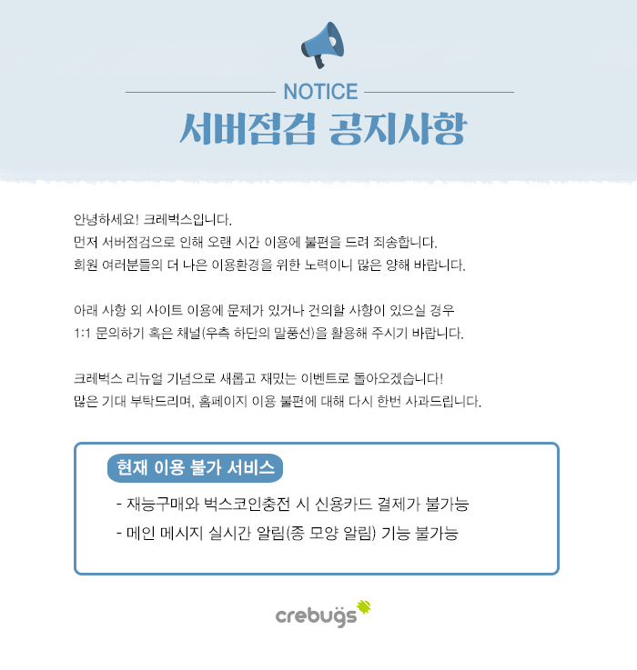 [서버점검 공지사항] 크레벅스 홈페이지 리뉴얼 긴급 서버점검 관련 공지사항