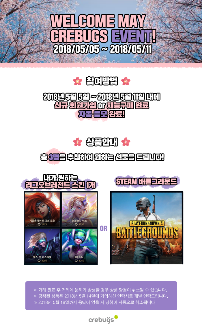 [종료][크레벅스 5월 맞이 EVENT] 내가 원하는 리그오브레전드 스킨! Steam 배틀그라운드 받아가자!!