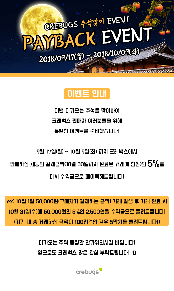 [크레벅스 추석맞이 EVENT] 판매 수익금 5% PAYBACK EVENT