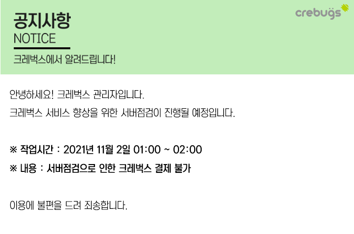 [공지사항] 크레벅스 서버점검으로 인한 결제 불가 안내