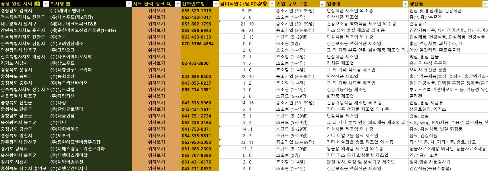 1. 초정밀 필터링! 수십만 건 데이터 속에서 추출한 건강기능식품 제조업체 리스트로, 잠재 고객을 정확히 찾아드립니다. 압도적인 효율성으로 시장 틈새를 공략하세요!