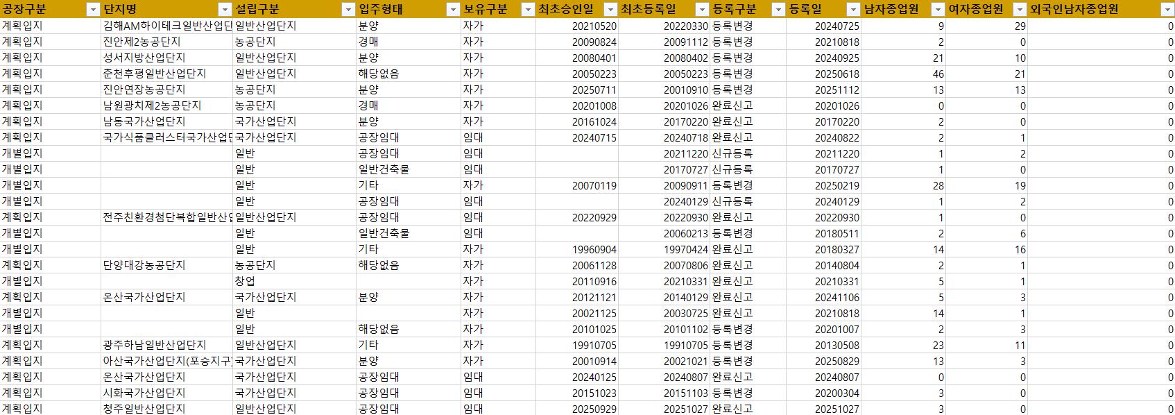 - 설립구분, 입주형태, 보유구분, 최초승인일, 최초등록일, 등록구분, 등록일, 남자종업원, 여자종업원, 외국인남자종업원, 외국인여자종업원, 종업원합계, 공장규모