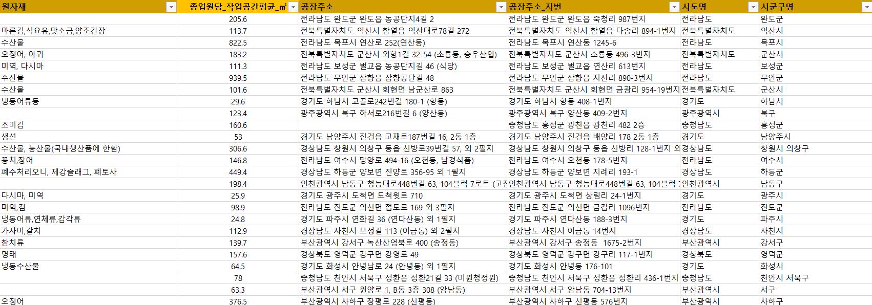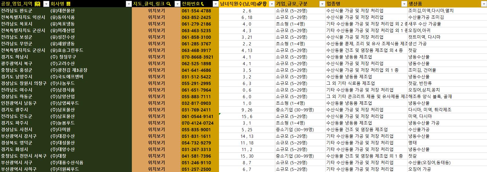 - 회사명, 전화번호, 업종명, 생산품, 원자재