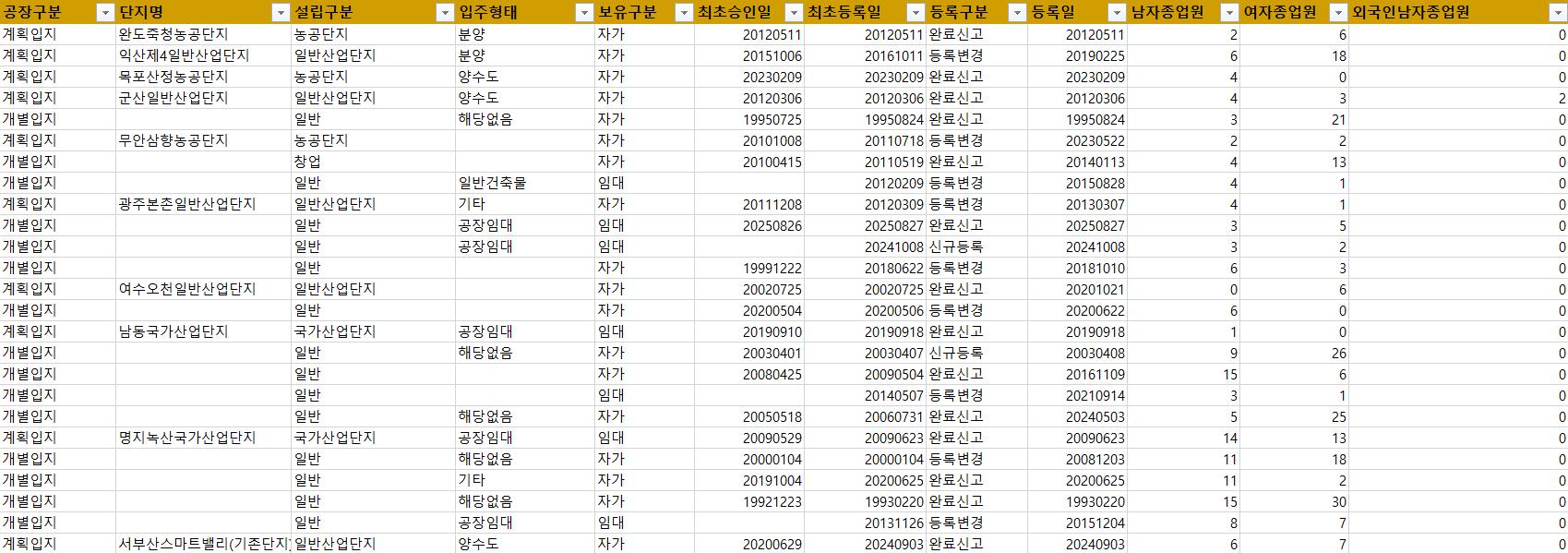 - 설립구분, 입주형태, 보유구분, 최초승인일, 최초등록일, 등록구분, 등록일, 남자종업원, 여자종업원, 외국인남자종업원, 외국인여자종업원, 종업원합계, 공장규모