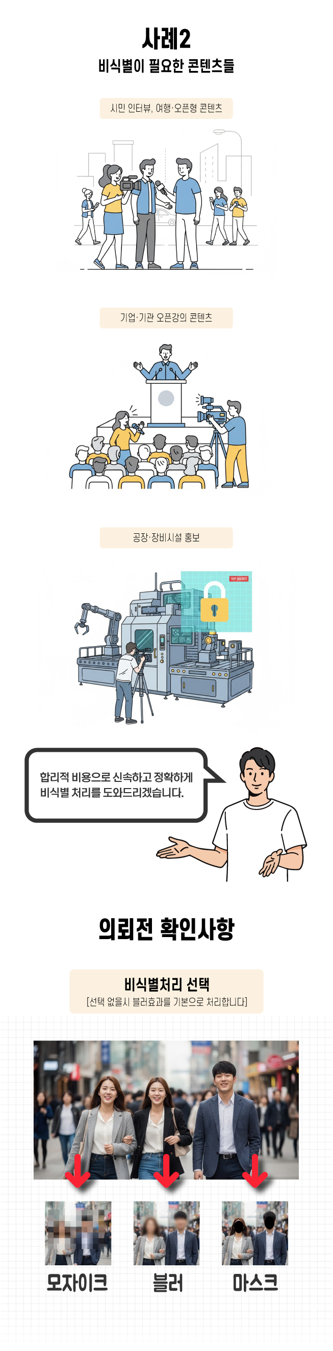 - 화질이 많이 떨어지는 비식별 처리가 어려운 경우 처리비용이 추가될 수 있습니다.