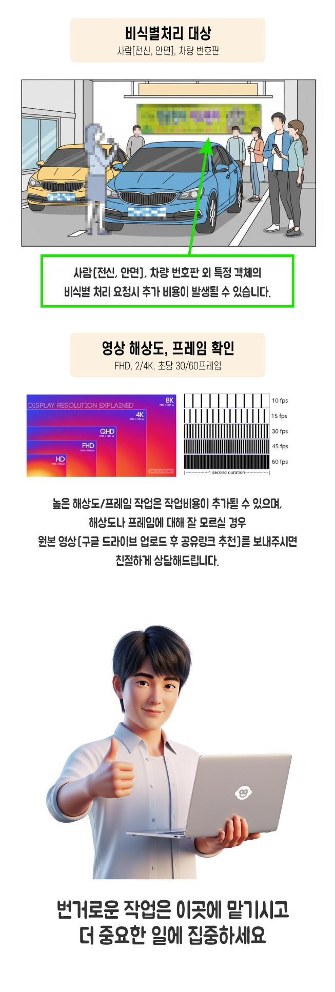 작업물의 분량, 수동트레킹, 안면이나 번호판 외 추가적인 비식별처리 요구 등의 제반사항에 따라 서비스 비용이 상이할 수 있으니 구체적인 상담 후, 구매 부탁드립니다.