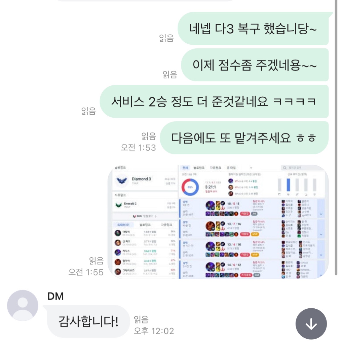 오늘의 날씨는1달 전5+1 이벤트 받고 진행했습니다 마스터 정글이 아니라 챌린저라고 해도 믿을정도로 그냥 게임하시고 친절하시고 답장도 빨라서 좋았습니다 다음에 또 연락드릴게요!