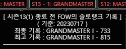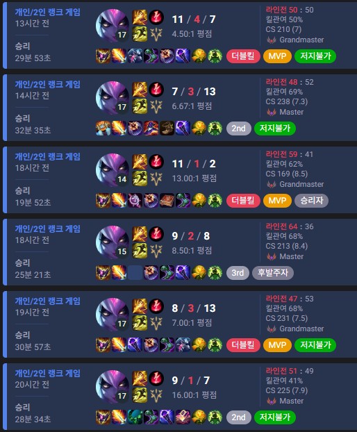 시즌10 에 처음 마스터를 달성하여 10, 11, 12, 13 전체, 14 전체, 15시즌 마스터 550++