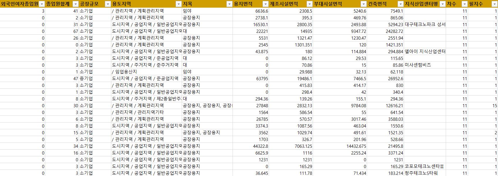- 공장주소, 공장주소_지번, 시도명, 시군구명, 공장구분, 단지명, 용도지역, 지목, 지식산업센터명, 차수, 필지수