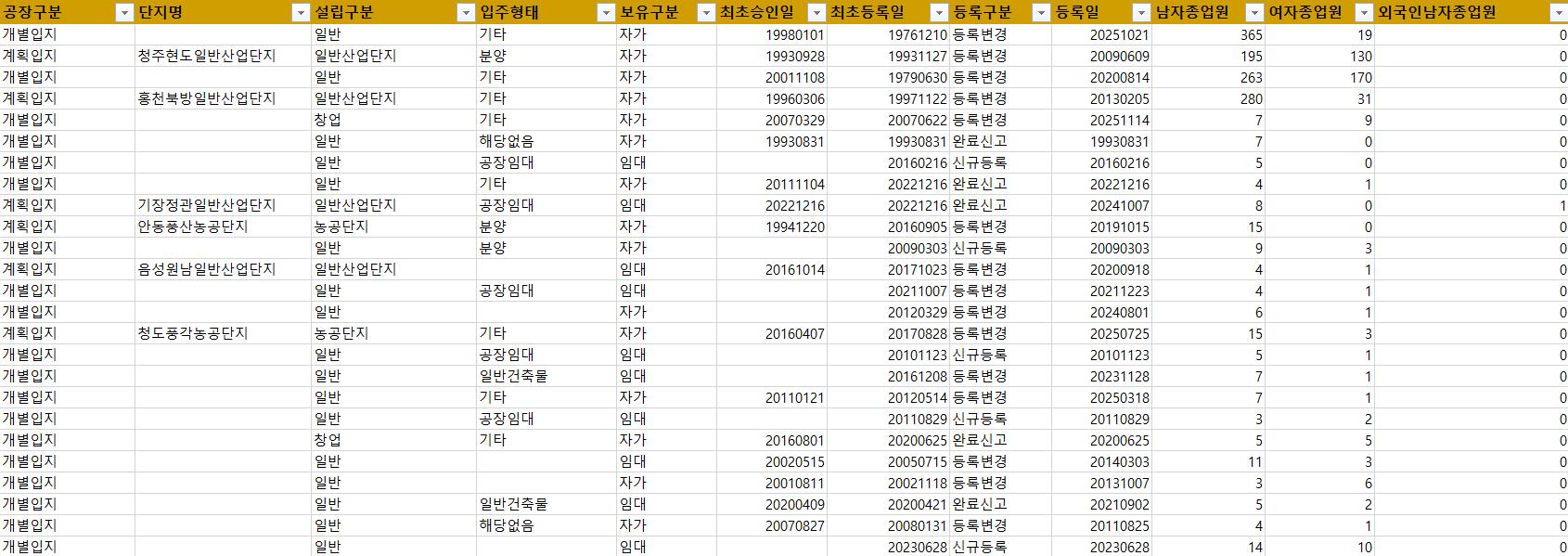 - 설립구분, 입주형태, 보유구분, 최초승인일, 최초등록일, 등록구분, 등록일, 남자종업원, 여자종업원, 외국인남자종업원, 외국인여자종업원, 종업원합계, 공장규모