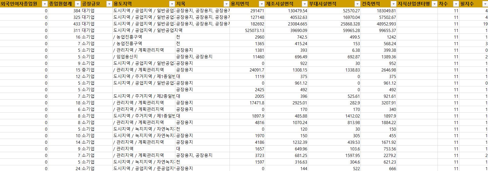 - 공장주소, 공장주소_지번, 시도명, 시군구명, 공장구분, 단지명, 용도지역, 지목, 지식산업센터명, 차수, 필지수